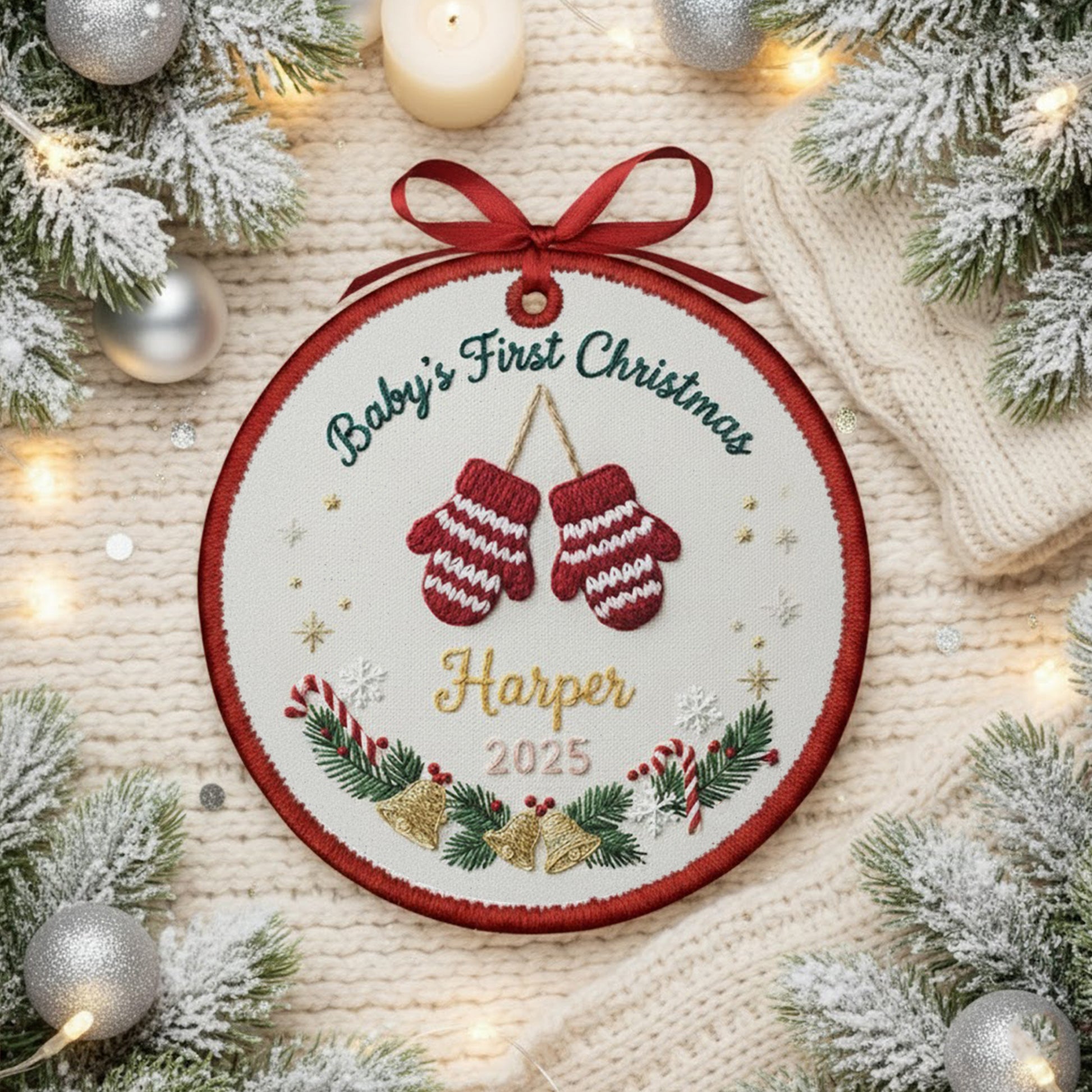 Personalized Embroidered Baby’s First Christmas Ornament 2025 – Custom Canvas Mittens Keepsake Gift for Newborn, Xmas Embroidered Ornament