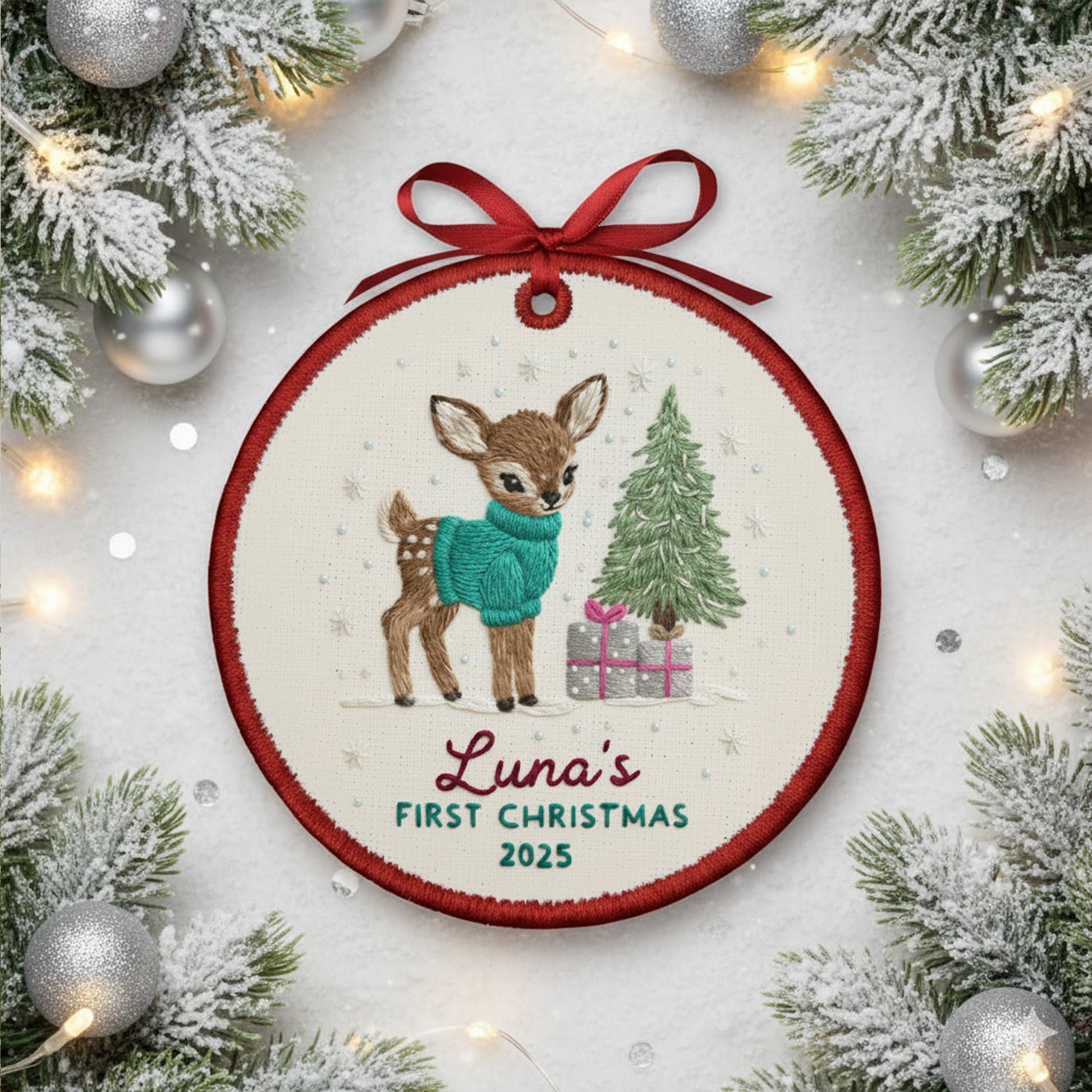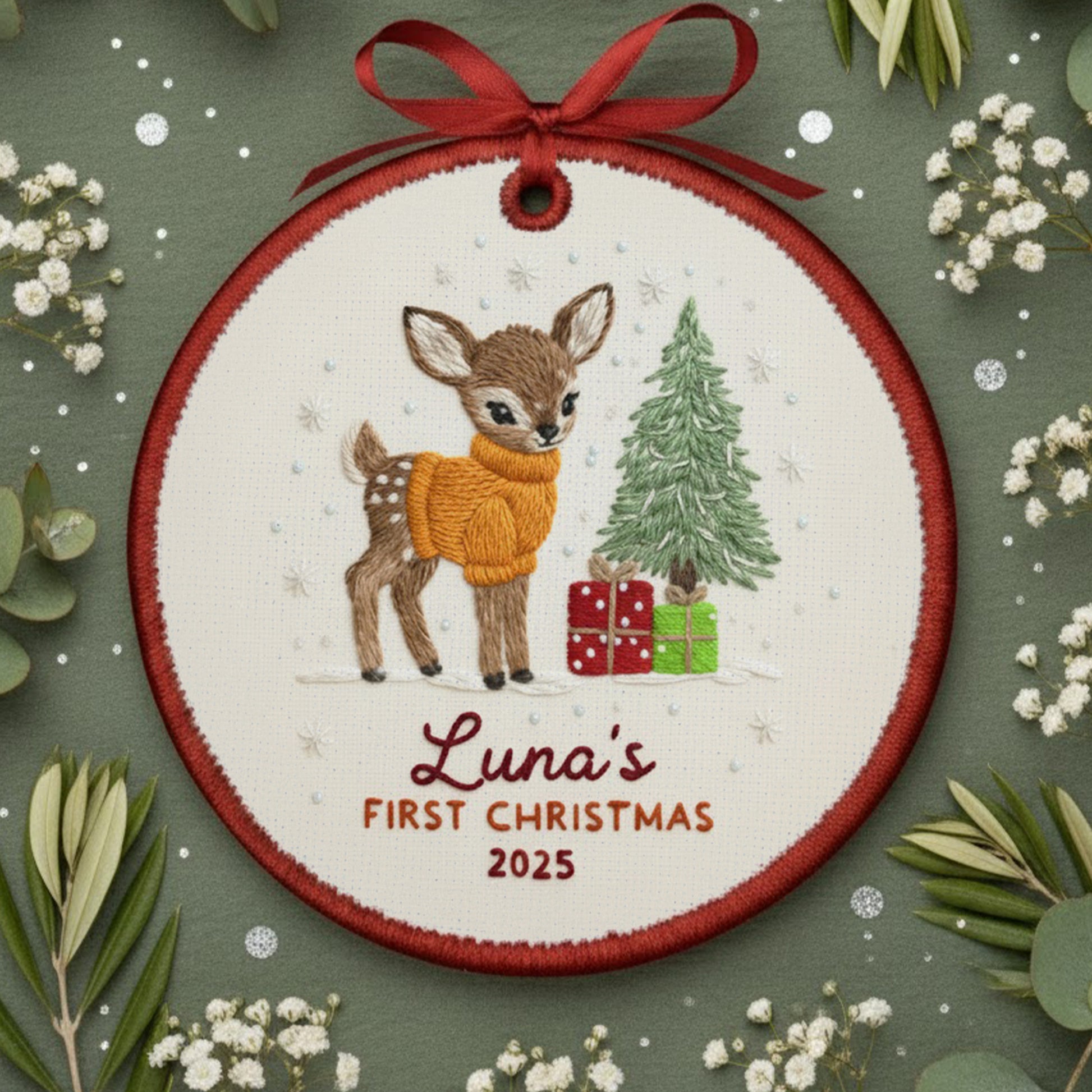 Personalized Embroidered Baby’s First Christmas Ornament 2025 – Custom Canvas Reindeer Keepsake Gift for Newborn, New Baby Gift