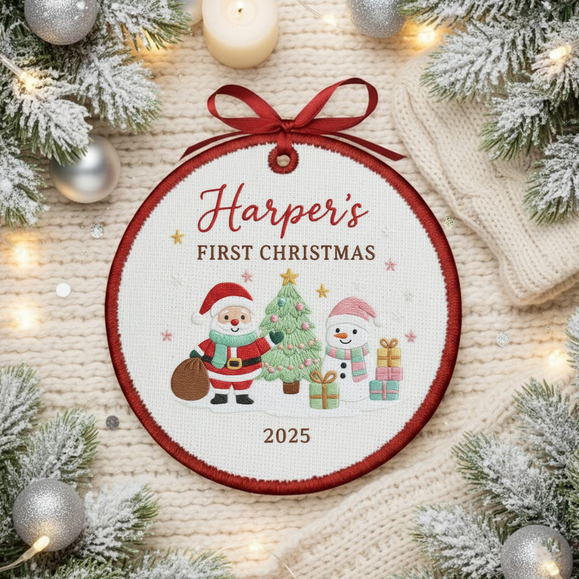 Personalized Embroidered Baby’s First Christmas Ornament 2025 – Santa and Snowman Custom Canvas Keepsake for Newborn, Embroidered Ornament