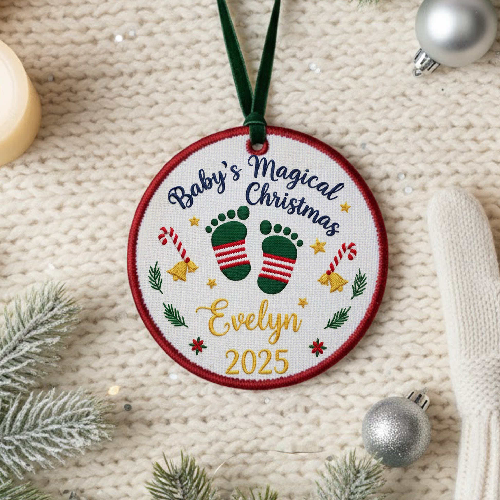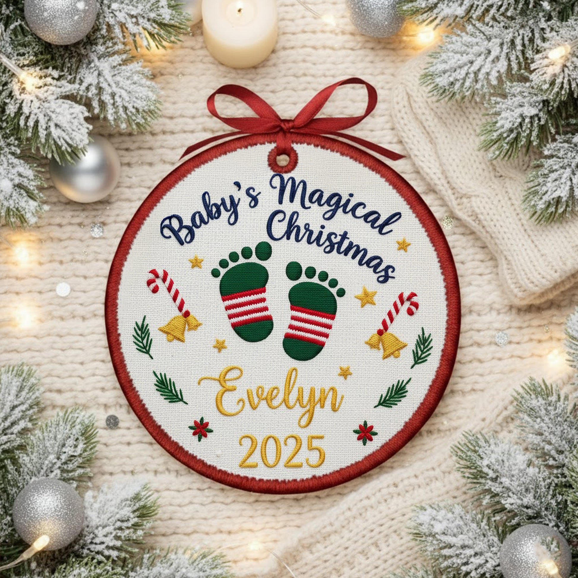 Personalized Embroidered Baby’s Magical First Christmas Ornament 2025 – Custom Canvas Keepsake Gift for Newborn, Xmas Embroidered Ornament